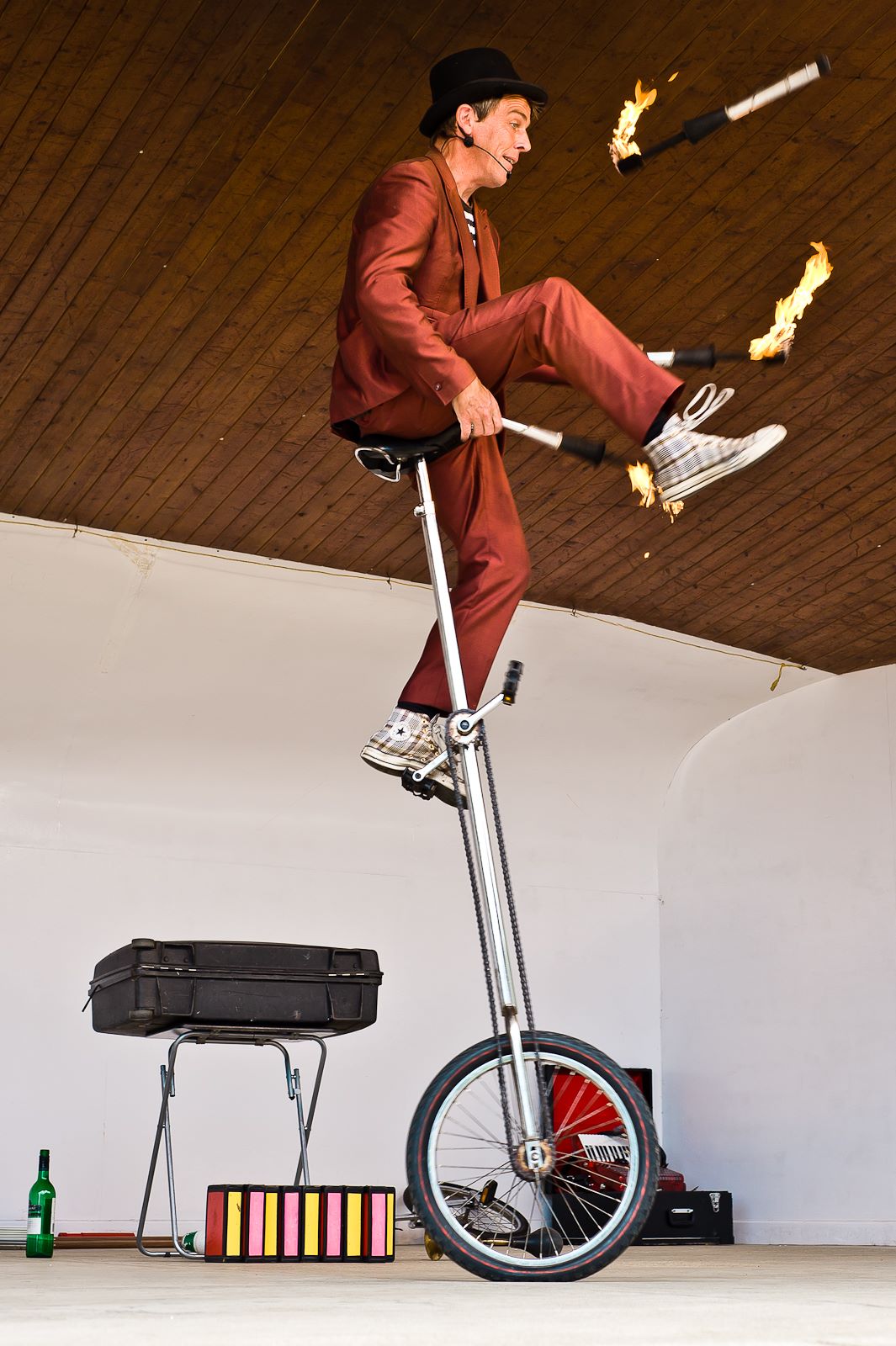 Elfic's vast array of circus skills includes high unicycling, ladder balancing, juggling of balls, clubs, china plates and fire, piano accordion playing on a unicycle, hat manipulation and treading on a horn whilst looking surprised. The tricks are all performed in his madcap style, with witty banter, a touch of magic, improvisation and audience participation.